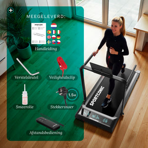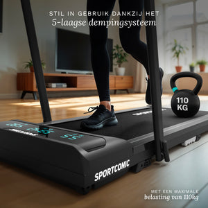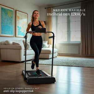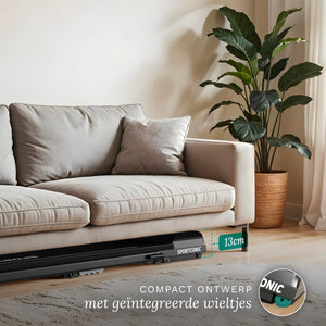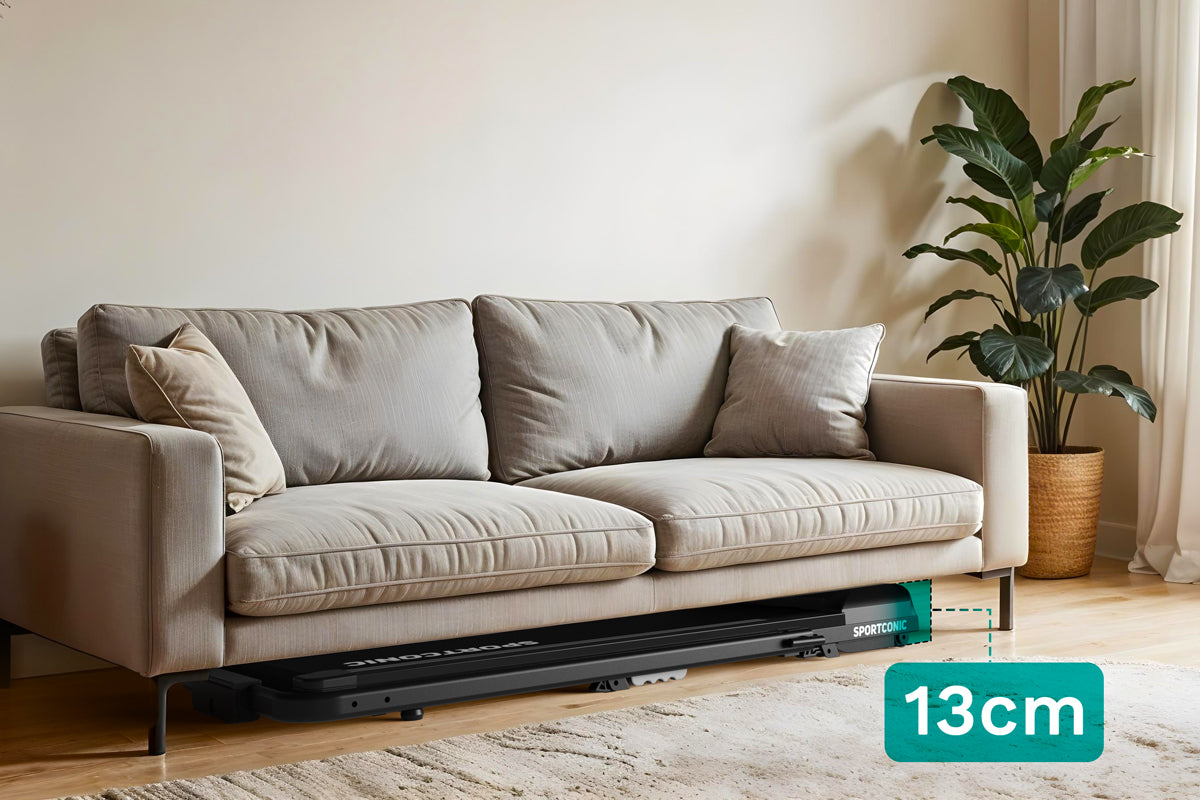 Il tapis roulant è ideale per l'uso domestico grazie al suo design intelligente e compatto. Con un'altezza da chiuso di soli 13 centimetri , scivola senza sforzo sotto un divano, un letto o un armadio. Le ruote integrate lo rendono facile e veloce da spostare, anche in spazi abitativi più piccoli.