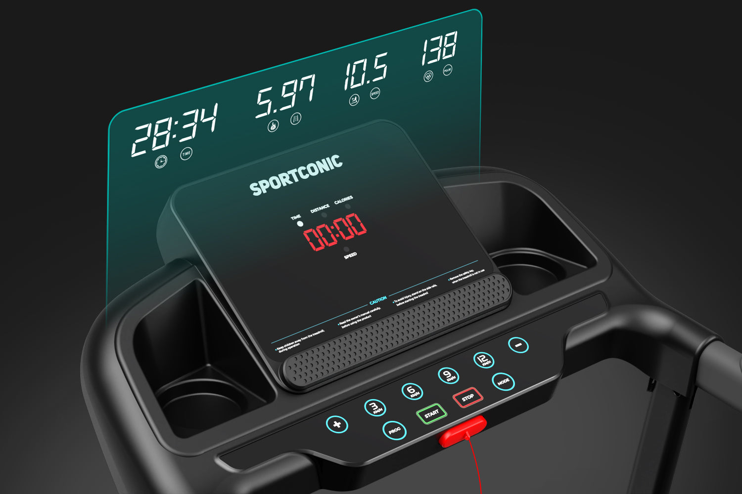 Il tapis roulant è dotato di un luminoso display LED che mostra in tempo reale distanza, tempo, velocità, frequenza cardiaca e calorie bruciate.